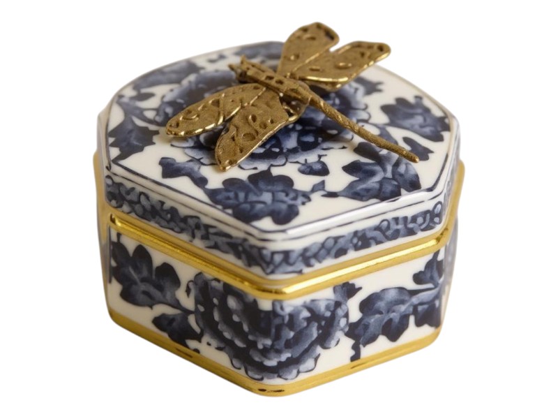 Vintage Hexagon Lidded Trinket Box Hand Painted Thailand Blue White with dragonfly brass.