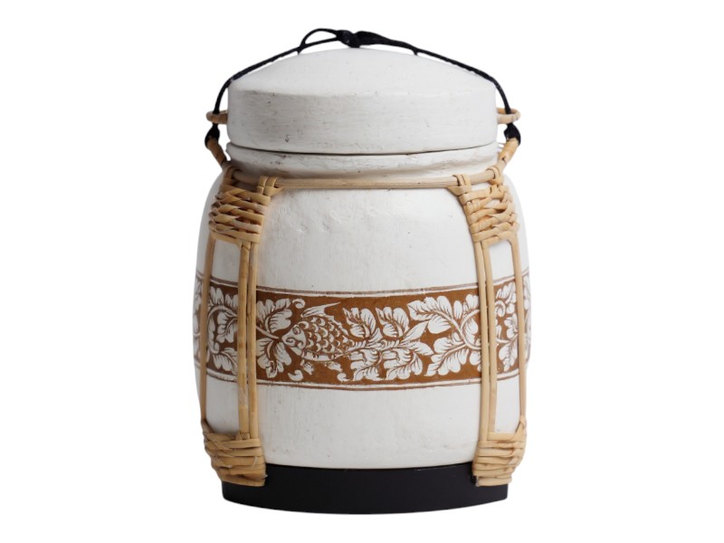 Twin Lotus Rice Jar (White & Gold Pair). Elegant paired jars with lotus motifs, symbol of purity and harmony. The “Lanna Thai Rice Basket Collection” revives the timeless elegance of Northern Thai artistry. Each piece is handcrafted from bamboo and wood, adorned with hand-painted Lanna motifs in gold leaf and lacquer, symbolising prosperity, grace, and the beauty of Thai heritage reborn for modern living.
