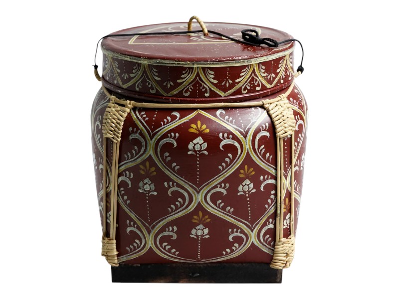 Ruby Vine Jar (Heart Pattern) Red lacquer jar with gold leaf heart motif, elegant and symbolic. The “Lanna Thai Rice Basket Collection” revives the timeless elegance of Northern Thai artistry. Each piece is handcrafted from bamboo and wood, adorned with hand-painted Lanna motifs in gold leaf and lacquer, symbolizing prosperity, grace, and the beauty of Thai heritage reborn for modern living.