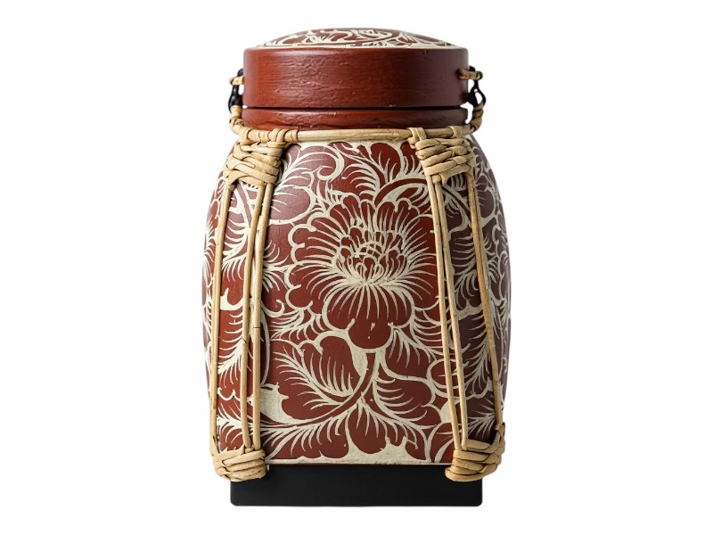 Golden Blossom Jar (Crimson Base) Red-gold lacquer jar with soft floral patterns, symbol of abundance. The “Lanna Thai Rice Basket Collection” revives the timeless elegance of Northern Thai artistry. Each piece is handcrafted from bamboo and wood, adorned with hand-painted Lanna motifs in gold leaf and lacquer, symbolising prosperity, grace, and the beauty of Thai heritage reborn for modern living.