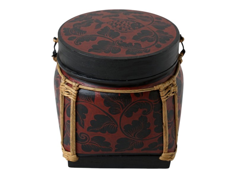 Royal Red Lotus Jar (Gold Scroll) Deep red lacquer with lotus scroll motifs and black lid. The “Lanna Thai Rice Basket Collection” revives the timeless elegance of Northern Thai artistry. Each piece is handcrafted from bamboo and wood, adorned with hand-painted Lanna motifs in gold leaf and lacquer, symbolizing prosperity, grace, and the beauty of Thai heritage reborn for modern living.