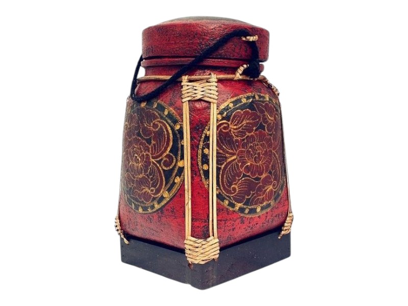 Chiang Mai Temple Jar (Red & Gold Relief) Hand-painted temple motif jar, inspired by Lanna mural art. Lanna Thai Rice Basket Collection. Where heritage lives in every curve and gold motif. Each handcrafted jar reflects the soul of Northern Thailand — combining bamboo structure, hand-painted gold lacquer, and centuries-old Lanna symbols of prosperity and harmony.
