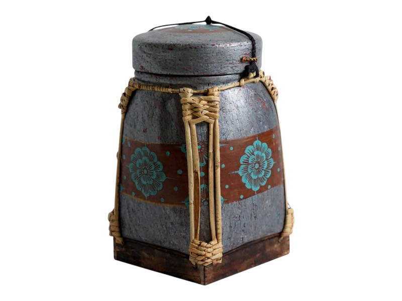 Blue Serenity Jar (Sky Blue with Gold Trim) Cool blue tone jar with bamboo framing and gold accent. Lanna Thai Rice Basket Collection. Where heritage lives in every curve and gold motif. Each handcrafted jar reflects the soul of Northern Thailand — combining bamboo structure, hand-painted gold lacquer, and centuries-old Lanna symbols of prosperity and harmony.