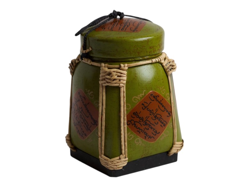 Emerald Blessing Jar (Green & Gold Lanna Pattern) Bright green lacquer with gold lattice pattern, symbol of prosperity. Lanna Thai Rice Basket Collection. Where heritage lives in every curve and gold motif. Each handcrafted jar reflects the soul of Northern Thailand — combining bamboo structure, hand-painted gold lacquer, and centuries-old Lanna symbols of prosperity and harmony.
