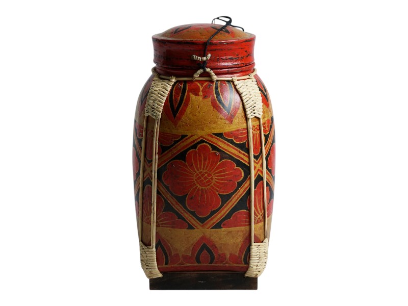 Golden Harmony Rice Basket (Crimson Gold Pattern) Red base with golden Lanna lattice motifs. Lanna Thai Rice Basket Collection. Where heritage lives in every curve and gold motif. Each handcrafted basket reflects the soul of Northern Thailand — combining bamboo structure, hand-painted lacquer, and centuries-old Lanna symbols of prosperity and harmony.