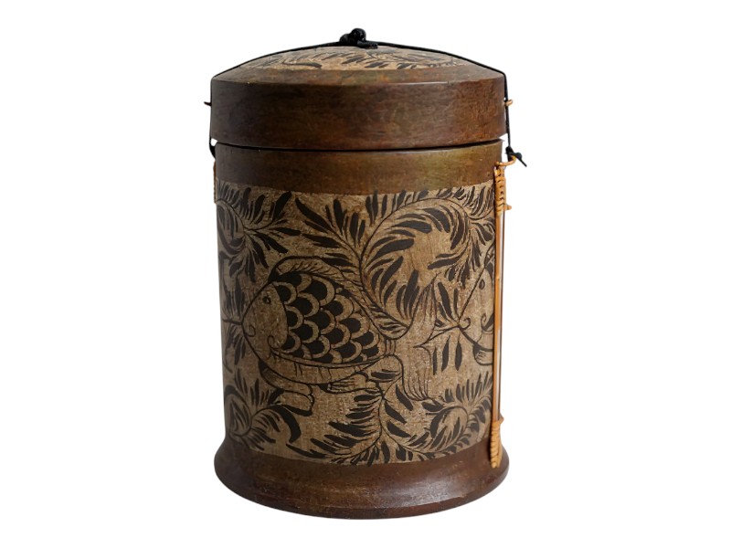 Sukhothai Cylinder Basket (Floral Scroll Pattern). Cylindrical jar with classic floral scrolls, warm brown tone. Lanna Thai Rice Basket Collection. Where heritage lives in every curve and gold motif. Each handcrafted Rice Basket reflects the soul of Northern Thailand — combining bamboo structure, hand-painted gold lacquer, and centuries-old Lanna symbols of prosperity and harmony.