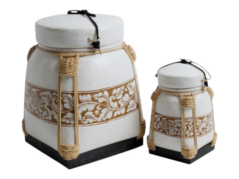Lanna White Heritage Jar (Gold fish) White lacquer with gold fish motifs and bamboo trim. The “Lanna Thai Rice Basket Collection” revives the timeless elegance of Northern Thai artistry. Each piece is handcrafted from bamboo and wood, adorned with hand-painted Lanna motifs in gold leaf and lacquer, symbolising prosperity, grace, and the beauty of Thai heritage reborn for modern living.